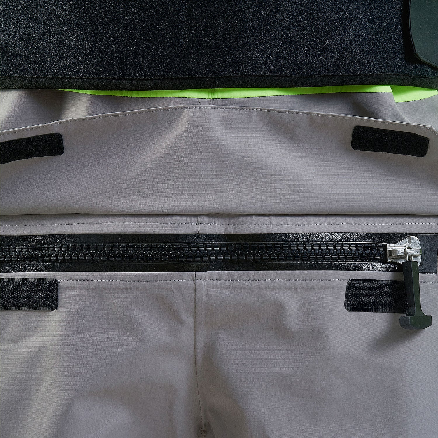 - The drysuit features a YKK waterproof zipper. Zip it up slowly and straight to avoid pinching fabric or causing damage.
